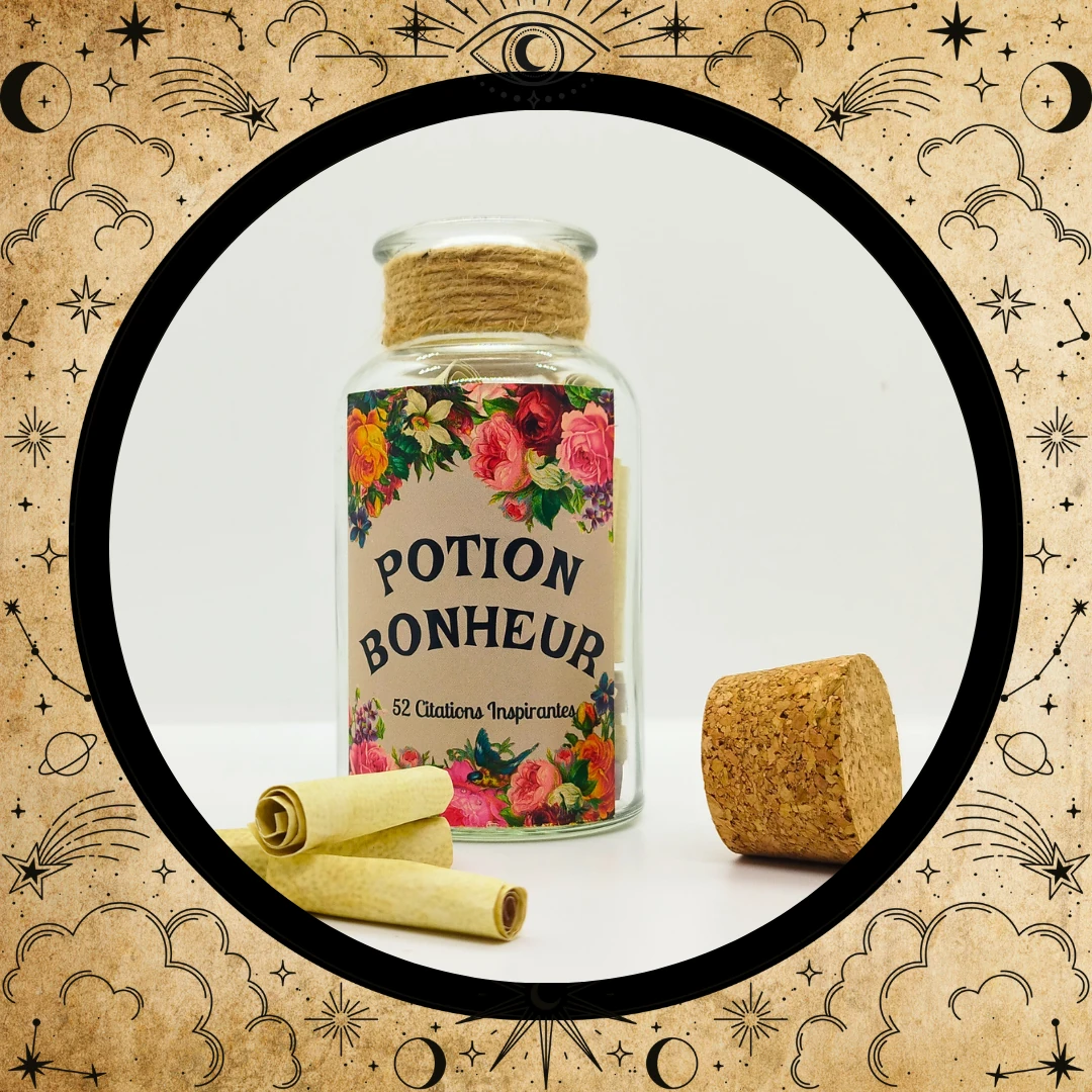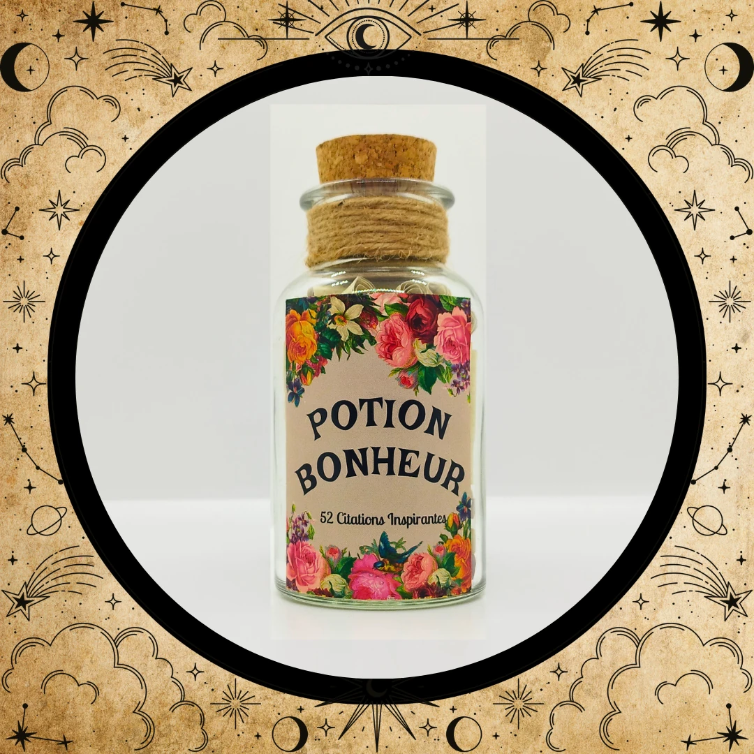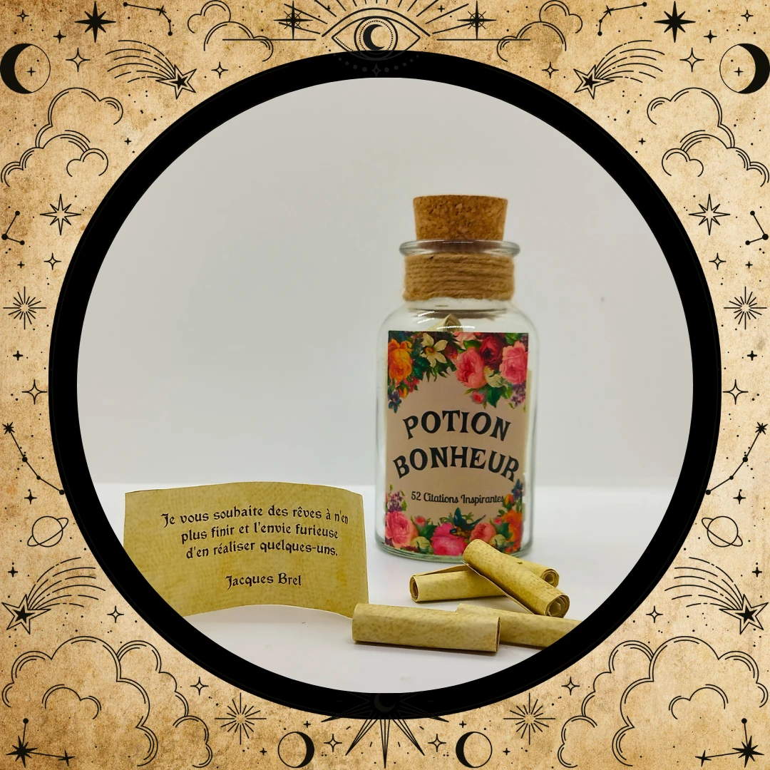 La potion bonheur est une bouteille en verre (Hauteur 15,00 cm – Largeur 7,00 cm) qui contient 52 parchemins où sont inscrites 52 citations inspirantes.