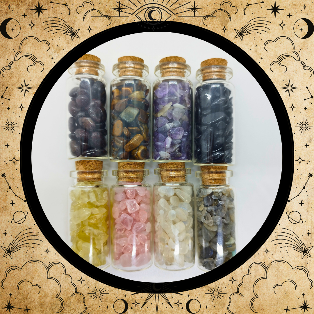 ✨ Fiole en verre renfermant des éclats de pierres fines, choisies avec soin pour leurs vibrations et leurs couleurs uniques. Chaque Stones Jar est une capsule d’énergie minérale : un talisman à poser près d’un autel, d’une bougie, à emporter sur soi ou à offrir comme porte-bonheur. ✨