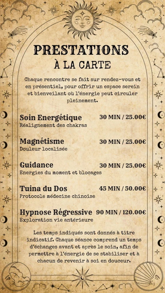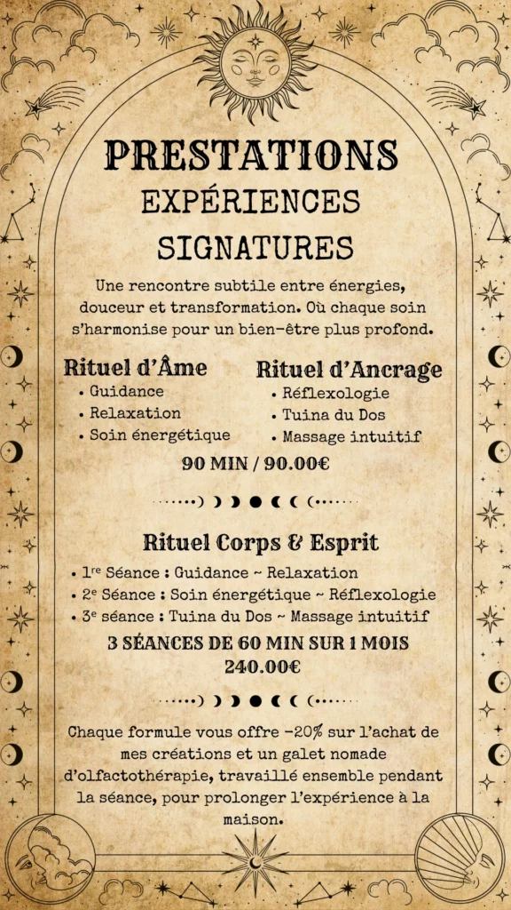 ✨ Aujourd’hui, je mets ces outils et ces expériences à votre service dans une démarche de mieux-être. Guidance, soin énergétique, accompagnement spirituel, magnétisme, hypnose régressive… Toujours avec bienveillance, humilité et authenticité. ✨